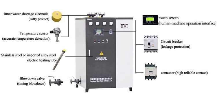 Rated thermal power: 0.03–0.65 MW; Rated working pressure: Ordinary pressure; Total heating capacity: 25,000–542,000 kcal; Input power: 30–650 kW; Rated voltage: 3N AC 50Hz 380V; No noise, no pollution, clean and sanitary, truly real green products. Using electricity as the heating source, no smoke-output loss, heating efficiency can reach up to 98%. Using high-quality stainless-steel or alloy-steel electric-heating tubes to ensure long-term boiler-safety operation.